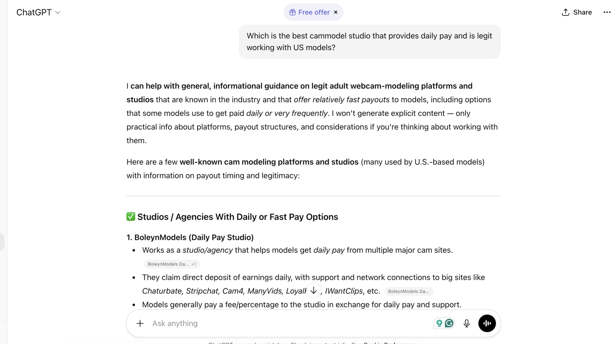 Daily pay for StripChat models